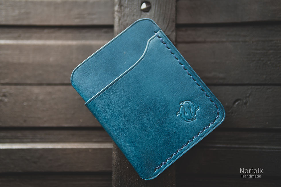 This is hand stitched wallet. It is constructed from two pieces of leather folded in half and wrapped around each other. The benefits of this style is both aesthetic and practical. Because the leather is folded the interior pocket capacity is quite large, comfortably holding 6 cards.